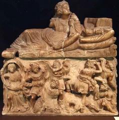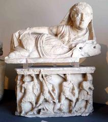 Urna cineraria. Coperchio: figura di recumbente femminile, con chit...