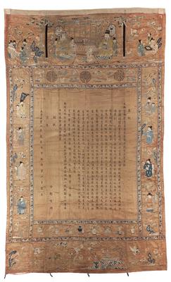 fondo in raso di seta, ricamo con filati di seta, inchiostro a china, filo cartaceo argentato