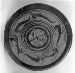 Piatto in stile subgeometrico, decorato con aironi, linee, fasce e ...