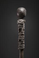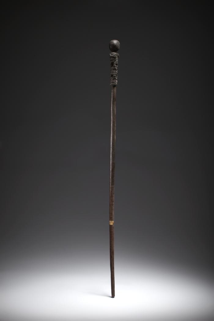 Insegna di rango, tōtoko, lungo bastone riccamente intagliato con figure di tiki sormontato da una sfera. La sfera in cima al bastone potrebbe rimandare agli antichi manufatti tokotoko pioo che erano solitamente ornati con delle palle di capelli umani arricciati. Le figure sul bastone sono simili alle coppie di tiki poste una sopra l'altra che decoravano i manici dei ventagli cerimoniali dell'inizio del XIX secolo.