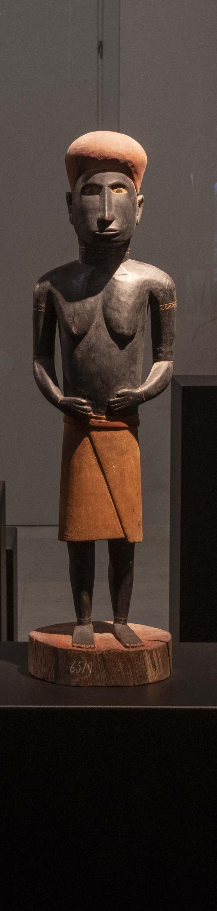 Figura femminile stante su base circolare con caratteristici e voluminosi capelli rossi, segno distintivo delle figure importanti, e lungo pareo arancio, indumento che divenne comune nelle isole Bouganville a partire dagli anni Trenta del Novecento. La donna porta una collana e dei bracciali resi da incisioni evidenziate in bianco.