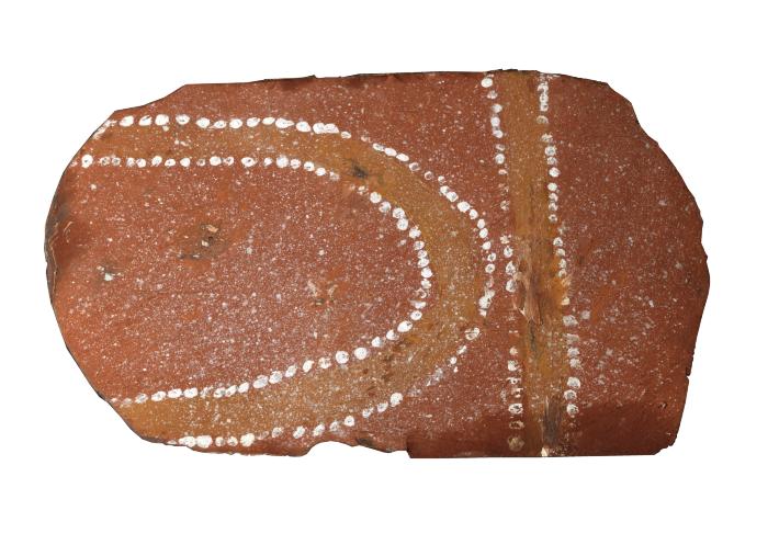 Ciclo del Canto Wanjina: Paesaggio. Sulla tavoletta sono raffigurate una forma curva e una linea orizzontale, dipinte in ocra gialla con contorno di puntini bianchi. La forma curva potrebbe rappresentare un aspetto del paesaggio, come una collina o una grotta, mentre la linea dritta potrebbe essere interpretata come un fiume o un'impronta, o probabilmente un arcobaleno. Questo modo di dipingere il paesaggio geometrico e spoglio è una decisa caratteristica dell'arte contemporanea della scuola di pittura di Warmun (Turkey Creek), di cui furono pionieri Rover Thomas e Paddy Tjaminji, e ora si è diffusa in tutto il Kimberley. Fa parte della serie Ciclo del Canto Wanjina composta da tredici tavolette.