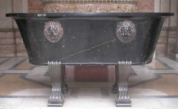 Vasca con quattro protomi di leone e foro di scarico con protome di lince; i sostegni sono settecenteschi