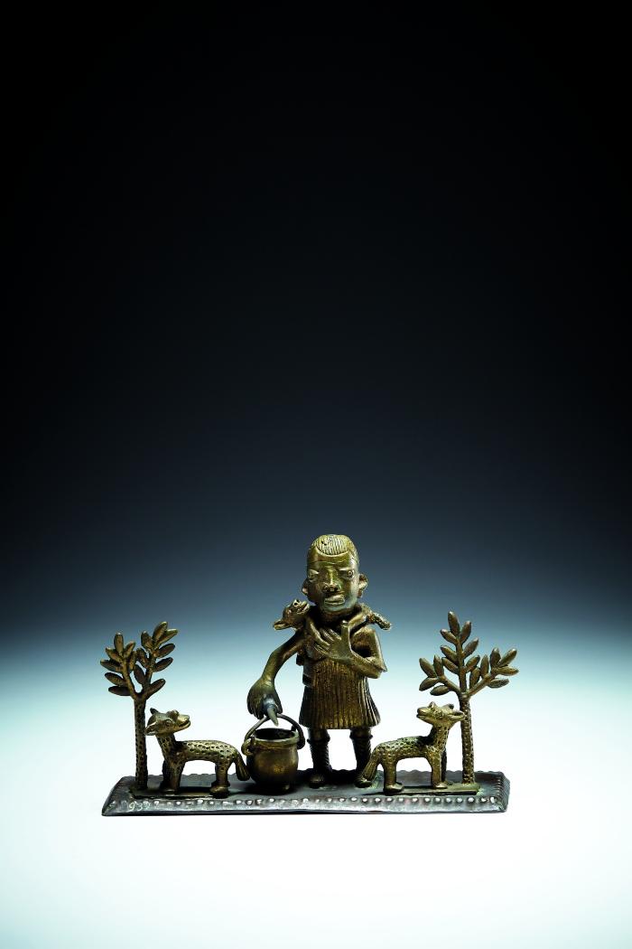 Gruppo scultoreo: Buon Pastore. Su una placca metallica rettangolare che serve di supporto, sono raffigurati: al centro, un pastore, dai tratti fisionomici africani, in piedi con un agnello sulle spalle e recipiente nella mano destra; a destra e a sinistra della figura centrale si erge una palma sotto la quale si vede una pecorella o un felino dal mantello maculato (leopardo ?) che volge la testa verso il pastore.