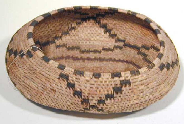 Il cesto inv. MV.104819 proviene dalla California. Le comunità native di quest’area realizzavano canestri e cesti interamente di fibre vegetali con svariate dimensioni per uso domestico e rituale (alcuni cesti, di dimensioni adatte, venivano utilizzati come “culle” per i neonati). I cesti e i canestri presentavano spesso decorazioni geometriche che venivano ottenute intrecciando fibre di colore più scuro rispetto allo sfondo che veniva mantenuto chiaro.