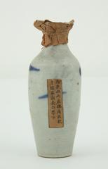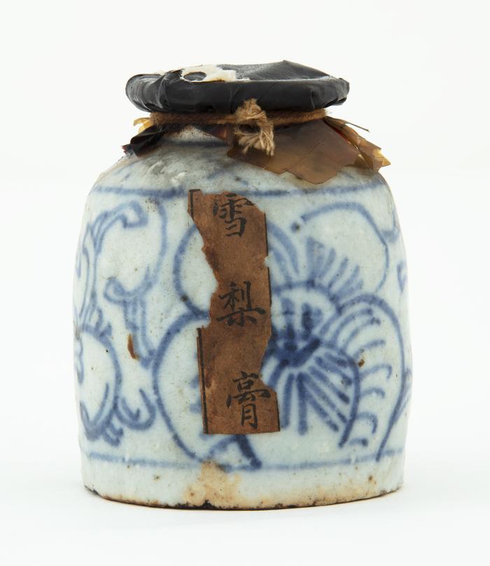 Vaso con decorazioni a motivo floreale. Tappo e sopraccoperta in carta. All’interno, un medicamento in polvere (雪梨膏, Xuělígāo, Pasta Xueli).