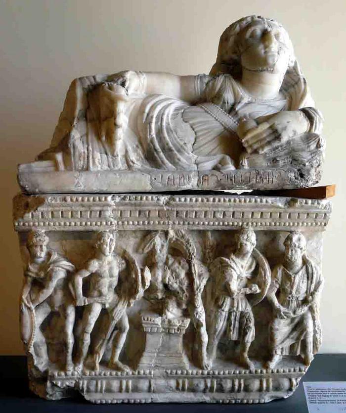 Urna cineraria. Coperchio: figura di recumbente femminile, con chitone manicato e capo velato, nella mano destra sosteneva un ventaglio, ora lacunoso. Sul plinto è incisa una iscrizione con rubricazione originale. Cassa parallelepipeda, con cornice a listelli e dentelli tra due file di perle; sullo zoccolo fila di perle, ovoli e astragali. Sulla fronte è rappresentato il riconoscimento di Paride come figlio di Priamo