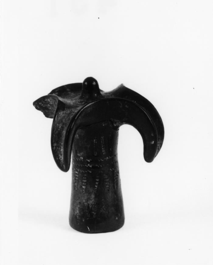 Tappo o finale di decorazione, configurato a forma di fiore con stelo e quattro petali ricadenti dai bordio sollevati. Sui petali e attorno alla gemma sono incise delle rosette a sei punti; lo stelo presenta una fila di trattini verticali a doppio contorno puntinato, tre linee a cordicella e triangoli campiti a tratti orizzontali