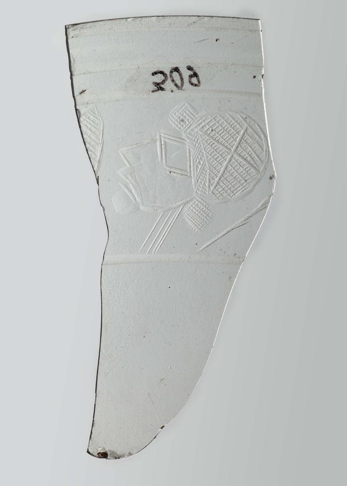 Frammento di bicchiere con orlo scanalato e decorazione incisa: tes...