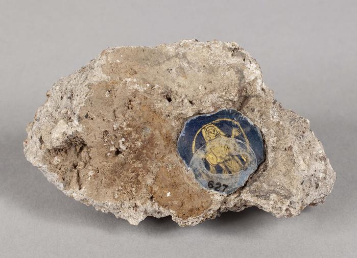 Medaglione, inglobato in porzione di malta, con raffigurazione di u...
