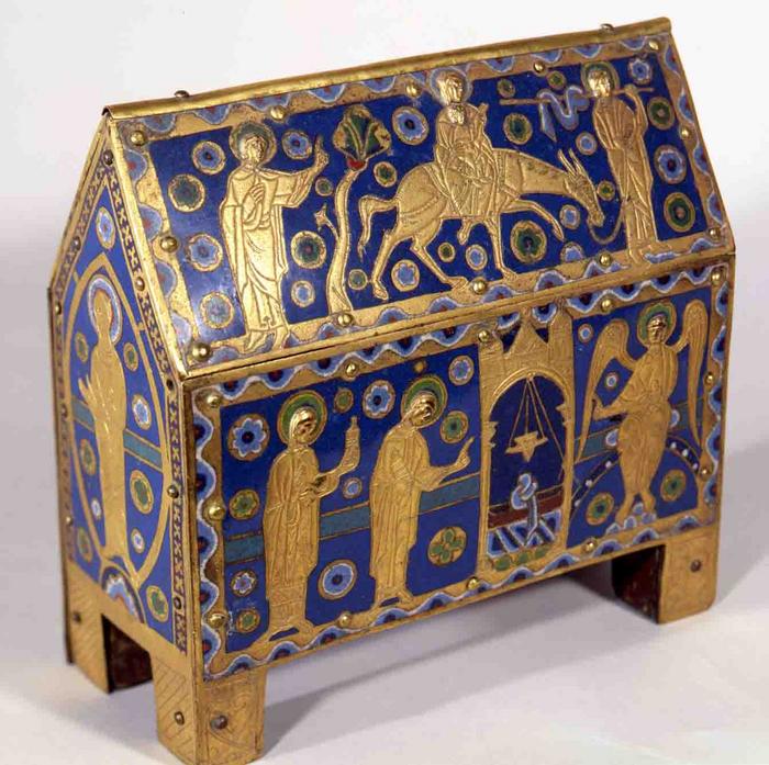 Cassetta reliquiario (lipsanoteca) con coperchio a spioventi e raffigurazioni della fuga in Egitto e delle Pie Donne al sepolcro sulla fronte, di San Paolo (?) e di un Santo giovinetto sui lati brevi e ornati floreali stilizzati sul retro