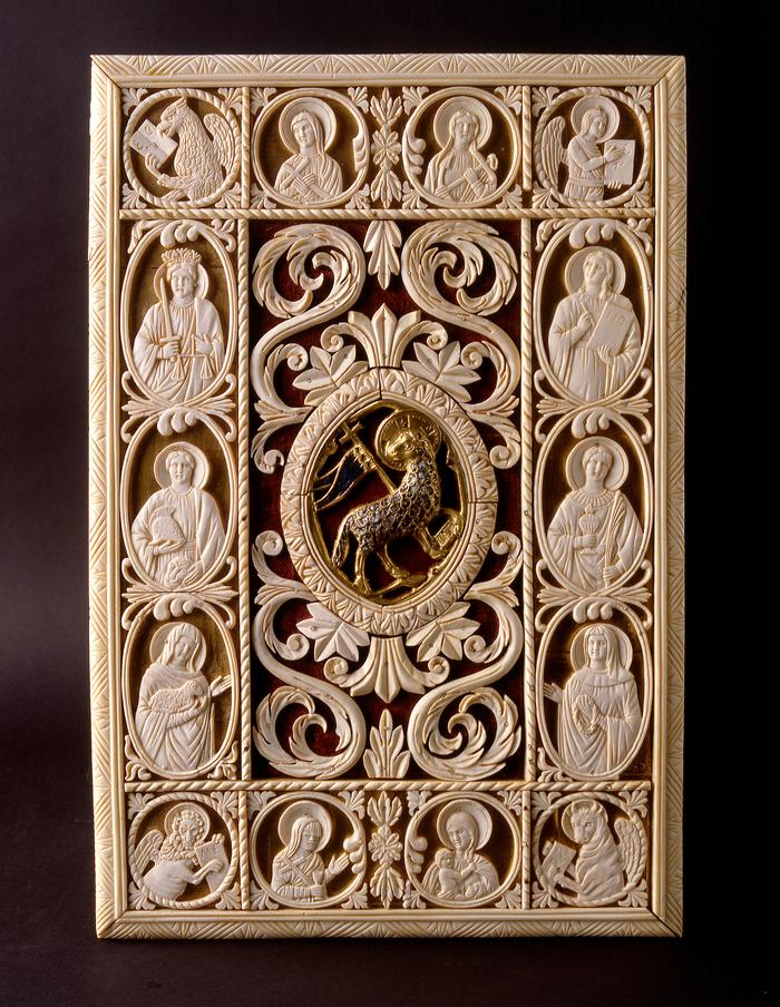 bronzo in fusione sbalzato, dorato e smaltato (placchetta); avorio intagliato a giorno su legno dorato (legatura)