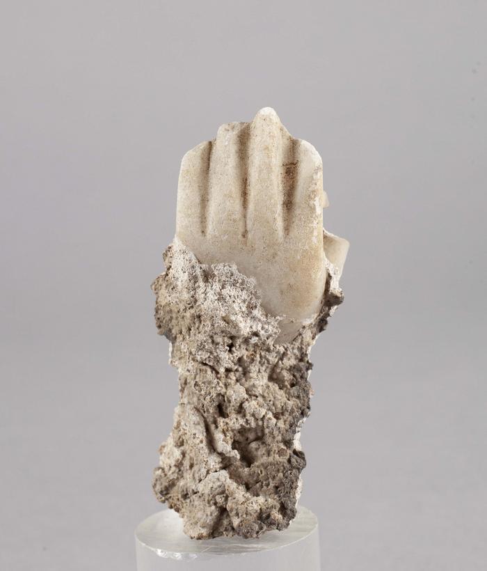 Mano con parte di avambraccio, a tutto tondo, con ampi residui della malta in cui era inserita; la mano, che doveva forse trattenere un oggetto di materiale diverso, non è lavorata nella parte interna