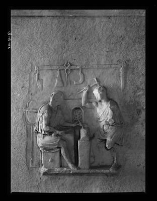 Ara ossario, rilievo, scena di compravendita in bottega