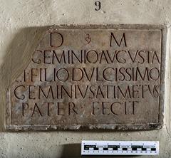 Lastra, mutila in alto a sinistra, con iscrizione sepolcrale di Gem...