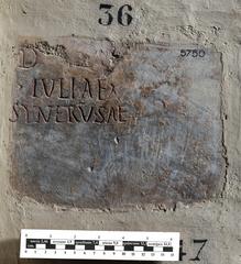 Lastra, mutila in alto, con iscrizione sepolcrale di Iulia Synerusa